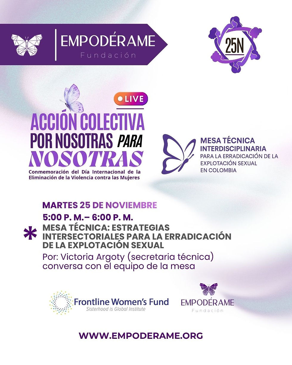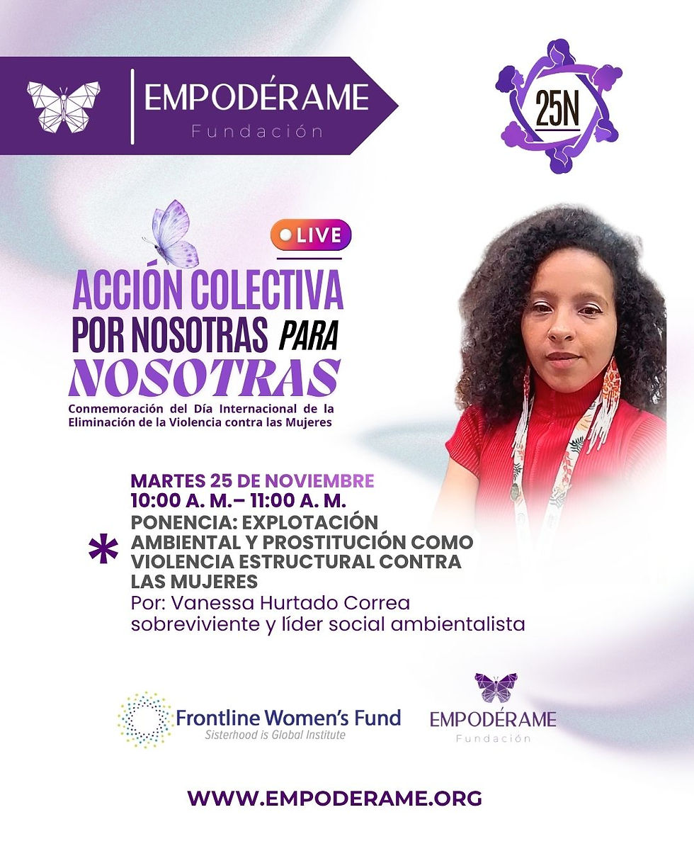 Para la Conmemoración del Día Internacional de la Eliminación de la Violencia contra las Mujeres, desde la Fundación Empodérame, extendemos la invitación a la jornada única de 12 horas, que reúne mujeres sobrevivientes, activistas, lideresas, defensoras de derechos humanos, colectivas, organizaciones sociales, profesionales del campo psicosocial, educativo y jurídico, llevan a cabo esta jornada titánica que aborda la explotación sexual y la prostitución como una de las violencias que históricamente han afectado a las mujeres, niñas, niños y adolescentes. "Acción colectiva por nosotras, para nosotras" es un formato propuesto por la Fundación Empodérame en las acciones de defensa de los derechos humanos de las mujeres, en un día para conmemorar a todas las que históricamente han aportado al reconomiento de las mujeres como sujetas de derechos y como víctimas de violencias estructurales propias del sistema patriarcal. Te presentamos a las ponentes en este maravilloso evento al que estás cordialmente invitada. Mujeres valientes que trabajan por cerrar estas brechas, por rescatarse así mismas y por ayudar a otras a no sucumbir entre tanta violencia en su contra.